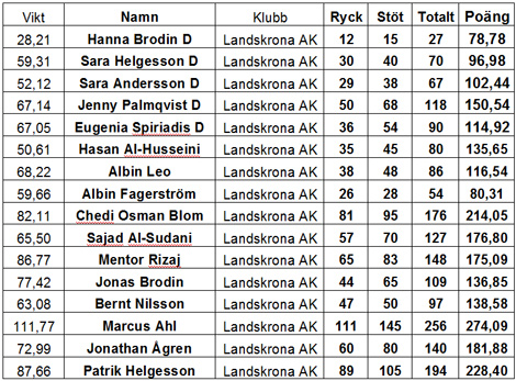 Två killar gjorde tävlingsdebut med den äran. Jonas Brodin klarade alla sina lyft och hans rekord ligger numera på 44 kg i ryck och 65 kg i stöt. Mentor Rizajs nya rekord är 65 kg i ryck och 83 kg i stöt. Bernt Nilsson, nestorn i laget, klarade 47 kg i ryck och 50 kg i stöt. Patrik Helgesson klarade 89 kg i ryck och 105 kg i stöt. sist av alla lyftande var Landskrona AK:s stjärna Marcus Ahl. Marcus var säkerheten själv och klarade alla sina sex lyft och puttade klubbrekorden i klass +105 kg, till 111 kg i ryck och 145 kg i stöt.