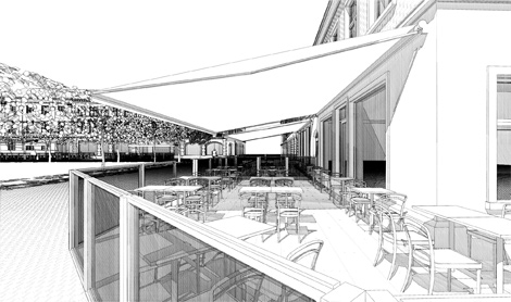 Uteserveringarna sänks ner till gatunivå. Illustration: Bengt Husritare AB
