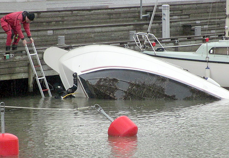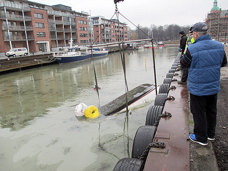 Sedan drogs båten över till andra sidan inloppet för att lyftas upp med kran.