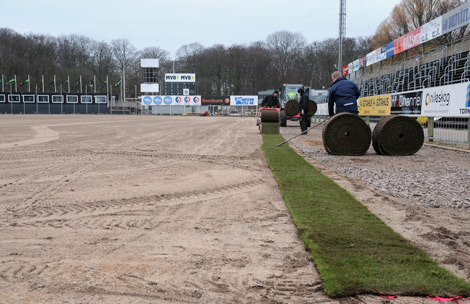 Idag kom de första rullarna gräs till Landskrona IP och bara en kort stund senare rullades de första metrarna ut.