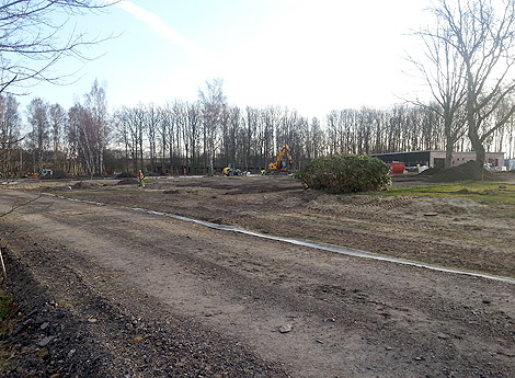 Arbetet med att anlägga den nya campingen pågår för fullt. I början av juni kommer de första campinggästerna att kunna ta plats men mer blir det inte i år. Receptionsbyggnaden till höger på bilden står inte klar förrän i augusti och golfklubbens verkstadslokaler som skymtar bakom träden i bakgrunden kan inte tömmas och rivas förrän senare i sommar. Därför kommer inte campingen att kunna öppnas fullt ut förrän 2015.