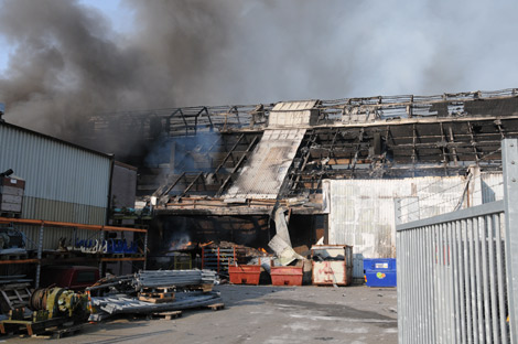 Förvriden plåt och annat bråte ligger intill byggnaden som brinner.