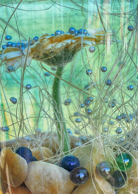 – Blommorna ligger i en oval skål fylld med vatten. Här finns smågodis som man annars dekorerar tårtor med. Bubblorna där är från en Treo, förklarar hon och liksom sina kamrater i fotoklubben anser att hon fått ovärderlig hjälp av kurator Hans Jonsson.