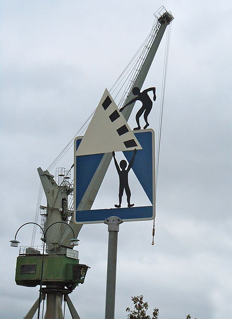För vad vi tror är tredje gången har Landskrona begåvats med en unik vägskylt. En musicerande Herr Gårman hade i morse lagt sig tillrätta med sin trumpet och spelar en trudelutt för hyresgästerna på Säbygatan. Konstverket, för det får man nog betrakta det som, är ytterst skickligt utfört och är placerat vid en handikapparkering i anslutning till den av Landskronahem nyligen renoverade gården mellan två höghus.