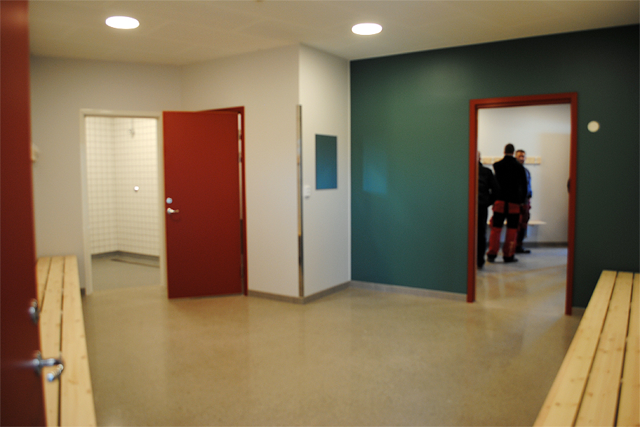 Utanför den nya huset står originalbänkar från 1924 som rustats upp inför invigningen. Arbetet med byggnaden startades i augusti i fjol med ett beslut om att en invigning skulle ske just den 1 april. I strålande solsken invigde fritidsnämndens ordförande, Birgitta Persson, byggnaden med tio omklädningsrum, domarrum och förråd.