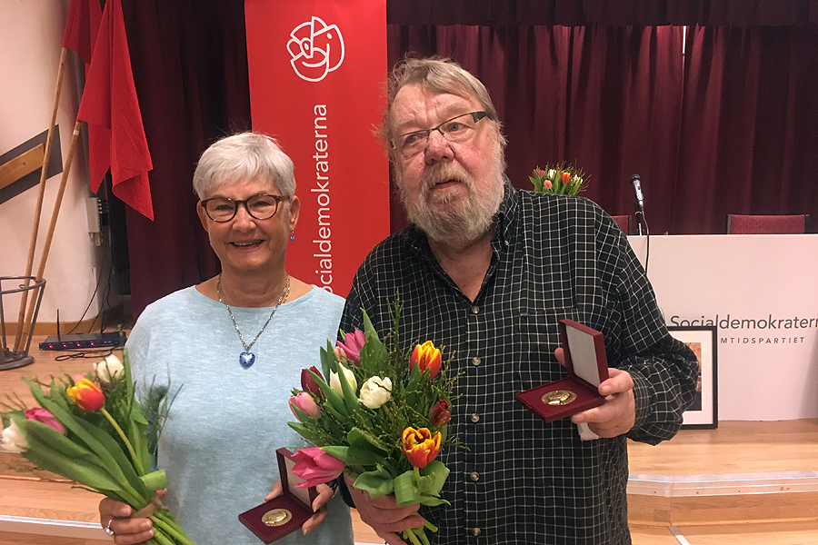 De båda tidigare kommunalråden Lars Wallsten och Marita Larsson tilldelades Brantingmedaljen efter många års arbete i partiet.