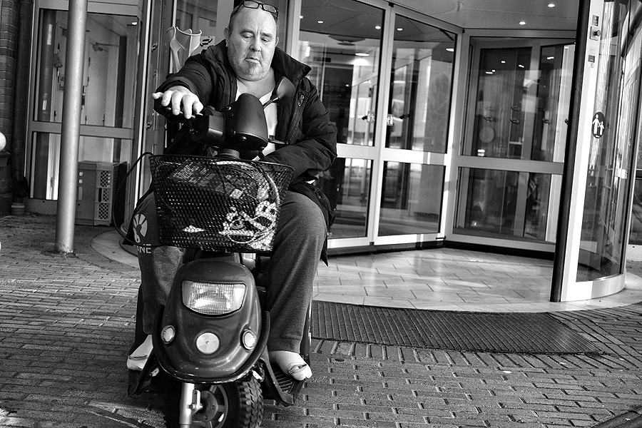 Pelle Friberg har rullat ut på stadens gator med sin permobil. Var han ska sova i natt, återstår att se.