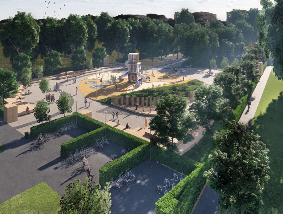 För de yngre barnen finns en spännande ”skog” att vandra genom med små hinder och kojor på vägen samt lekkullar, mindre rutschkana och gungor. För de äldre barnen finns bland annat en hög rutschkana, gungor och studsmattor. Det planeras också för en kickbikebana, en grillplats och matplatser där man kan äta medhavd fika. Lekplatsen kommer att utformas så att delar av den passar för barn med funktionsvariationer.