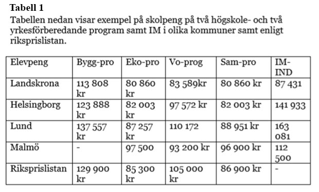 På tisdagen sammanträdde stadens utbildningsnämnd och på denna presenterades situationen för gymnasieskolan i Landskrona i ett åttasidigt dokument som är författat av Erik Åström, verksamhetschef för gymnasieskolan i Landskrona. I detta kan man läsa att Landskronas skolpeng, alltså den peng som kommunen betalar för varje enskild gymnasieelev, är mycket lägre än grannkommunernas. (se tabell 1) Men i nämnden är man kluven till en ökning.