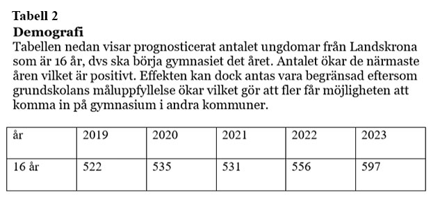 – Skulle Landskrona haft samma skolpeng som Helsingborg på samtliga program vårterminen 2019 så hade intäkterna på årsbasis gått från 37 268 642 kronor till 45 422 469 kronor, alltså en positiv differens på 8 153 827 kronor. Med samma elevpeng som Helsingborg hade vi alltså haft väsentligt bättre ekonomi. Demografin i tabellen nedan visar prognosticerat antalet ungdomar från Landskrona som är 16 år, dvs ska börja gymnasiet det året. Antalet ökar de närmaste åren vilket är positivt, skriver Erik Åström i sin presentation.