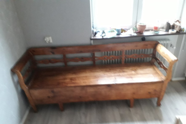 Köpte en fantastisk kökssoffa på loppis i fjol höstas. Minst 100 år gammal och i lite nationalromantisk stil. Inte ett spik, bara trätappar. Jag gav 500 spänn! Dagligen, när jag sitter på en ännu äldre stol, under köksfläkten, med den egenhändigt rullade kåldolmen i ena handen och kaffekoppen i den andra, kan jag inte låta bli att beundra detta hantverk.