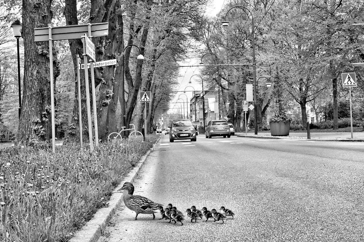 Hårt trafikerade Eriksgatan är dagens stora hinder. Bilisterna följer välvilligt ledsagarnas uppsträckta händer och Hjerti och hennes tio dunbollar ökar steglängden och är kvickt och elegant över i Slottsparken.