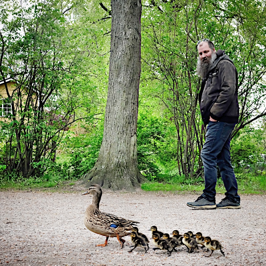 – I år la hon elva ägg på min innergård, tio kläcktes och nu ska vi leda de ner till vattnet, berättar Bo Wikström när hela sällskapet passerar förbi redaktionen.