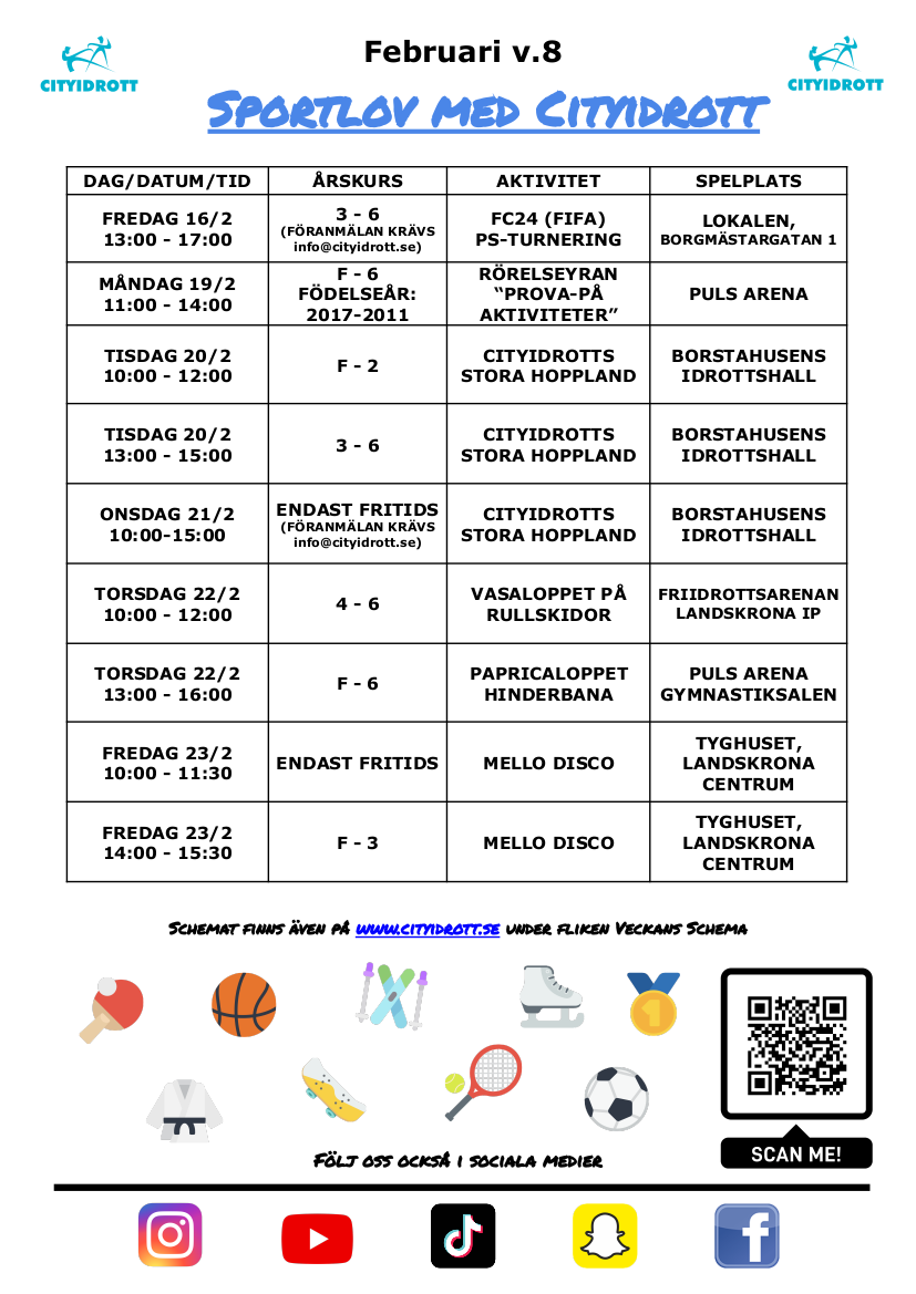 i december. På måndag är vi åter på Puls Arena och har rörelseyran light, med en massa olika prova-på aktiviteter. Föreningslivet kommer hit också. Förhoppningsvis hittar man något man tycker är kul och gärna vill fortsätta med. På tisdag och onsdag blir det Cityidrotts stora hoppland i Borstahusens idrottshall. Det har vi kört tidigare år och det är hur populärt som helst. På torsdag kommer vi först att ha ett Vasalopp på rullskidor borta på ”friidrotten” för de något äldre och sen på eftermiddagen blir det Paprikaloppet, en hinderbana här på Puls Arena. Sen avslutar vi på fredag med ett mello-disco på Tyghuset nere i stan. Då blir det glitter och glamour.