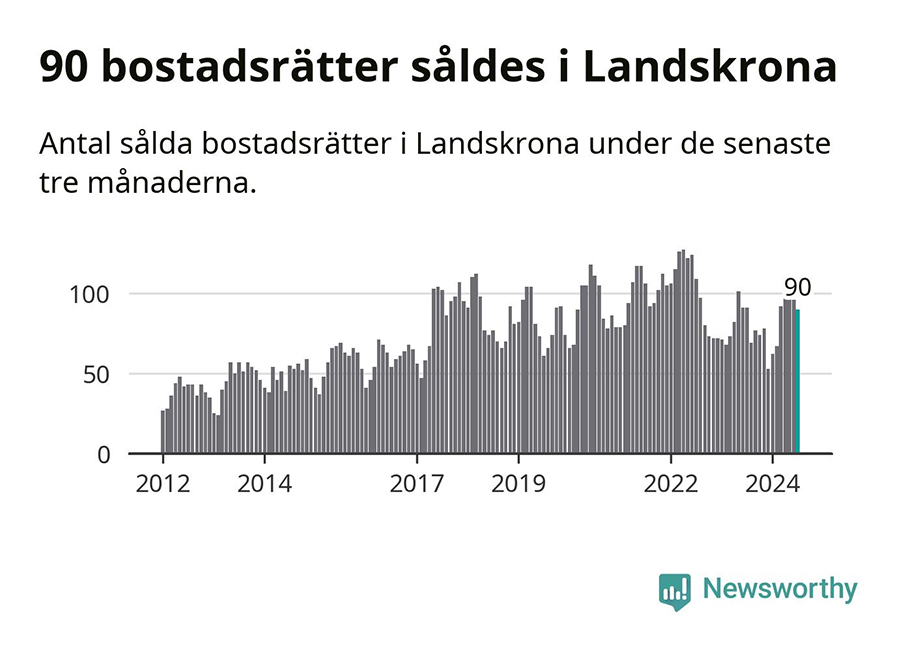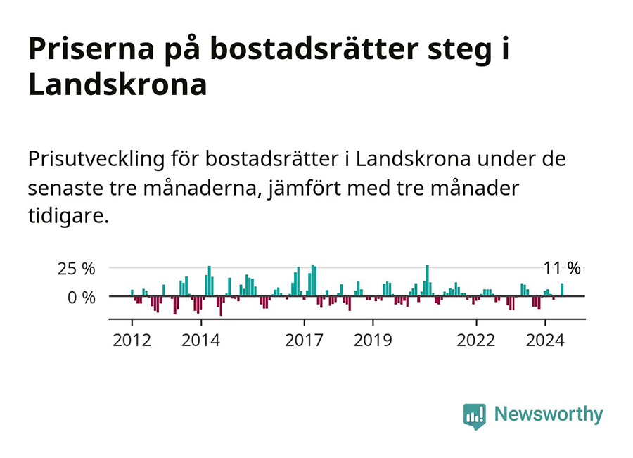 Priserna på bostadsrätter har gått upp i Landskrona kommun. Medelpriset på försäljningarna under de senaste tre månaderna visar på en uppgång med 11 procent. Det här visar ny statistik från Svensk Mäklarstatistik som nyhetsförmedlaren Newsworthy har analyserat och presenterat.