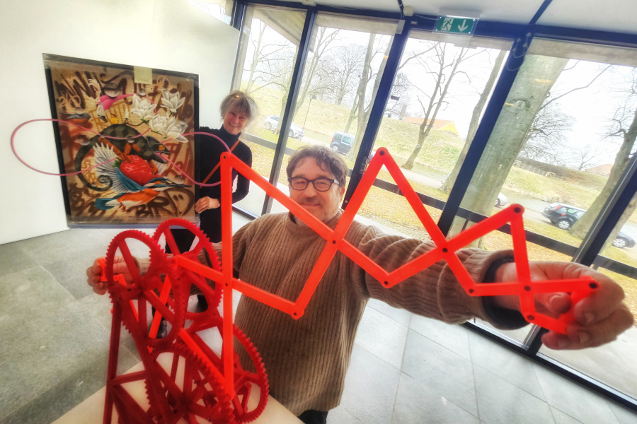 Morgan Ferm vid sin kinetiska skulptur och bakgrunden är Karin Müller Lindberg på väg att ställa Tim Timmeys (Nedrup) målning på plats.