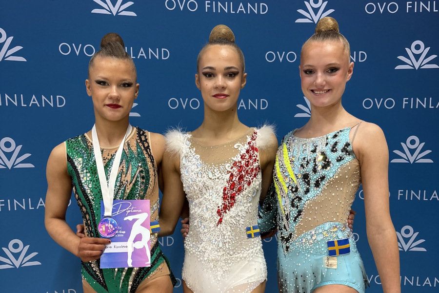 RYTMISK GYMNASTIK. I helgen befann sig Landskrona Kvinnliga GF:s juniorer Blanka Strandsjö, Engla Gustavsson och Daria Koroleva i Finland tillsammans med tränaren Matilda Westin för att delta i OVO Cup i Esbo.