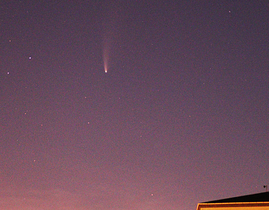 Farväl, komet Neowise! Kometen avlägsnar sig från oss med en hastighet av 180 000 kilometer i timmen, och är i kväll (26/7) på ett avstånd av 108 miljoner kilometer från jorden. Den är nu så ljussvag att den inte går att se för blotta ögat, och nätt och jämnt i en bra fältkikare. Men för den som har en sådan står kometen en bit under ”kärran” i Karlavagnen (Stora Björnen). Bifogar en karta och mitt foto av kometen. Augusti kan bli en bra månad om man gillar himlafenomen. Omkring den 12:e är det stjärnfallsfyrverkeri ”Perseiderna” (gör önskelista!) och planeterna Jupiter, Saturnus och Mars står i söder. Och vem vet, kanske det dyker upp en ny komet eller något annat intressant? Låt mig tillägga att astrofoto är väldigt jobbigt. Det behövs en ängels tålamod och varma långkalsonger.